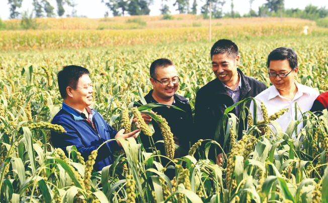 于爱军(左一)陪同农业农村局领导和河北巡天农业科技有限公司负责人观摩杂交谷子高产示范田 ■ 受访者供图